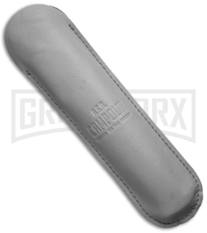 An impressive interpretation of the classic swinguard from A.G.A. Campoloin. This knife measures 13 inches when opened and has a stylized swinguard. This knife features a polished bayonet stainless steel blade and a solid nickel silver firing button. The rich stag handles are offset with brass pins over brass liners. The blade has fast, smooth action in spite of its size. The unique swinguard design gives the knife an almost medieval look. Includes a soft leather storage pouch.