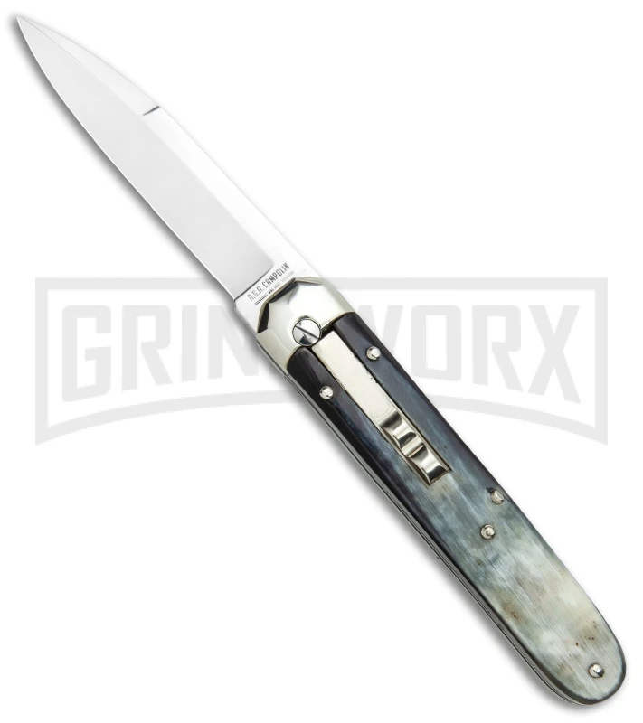 Offering an elegant and collectible design, this AGA Campolin Baron is a one of a kind piece worthy of any Italian collection. It features a fine stainless steel bayonet blade with an “A.G.A. Campolin” collector stamp on the tang. The authentic dark horn scales add a touch of tradition to this knife, as do the stainless bolsters, liners, and pins.